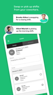 • Mobile access to clock ins, schedules, time off and shift swap requests. • Real-time schedule change notifications. • Daily schedule updates for scheduled employees. • Submit time-off requests and weekly availability. • Shift swap and release functionality for employees. • Message Center for manager and employee communication.