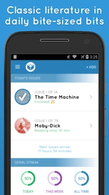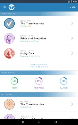 Serial Reader helps you fit classic literature into your busy life: Choose from more than 900 classic books and receive a new issue every day. Each issue can be read in 20 minutes or less. Read the best classic books in your spare time!