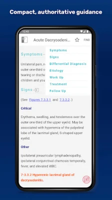 * A breakdown of conditions and diseases with sections on symptoms, signs, predisposing conditions, differential diagnosis, etiology, workup, treatment, and follow-up